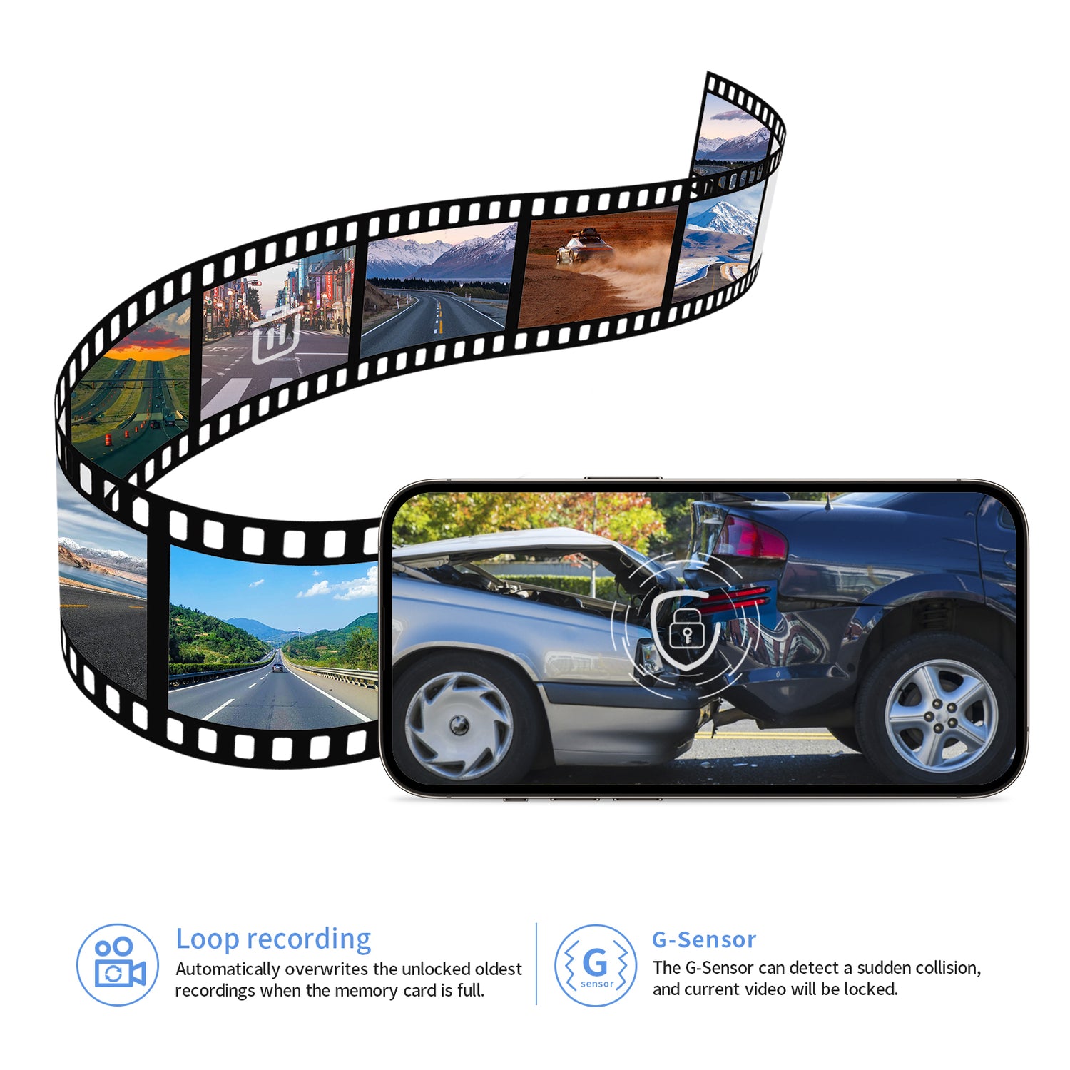 G-Sensor can automatically detect sudden collisions during driving, and immediately save the relevant lens video to the file to prevent overwriting, thereby protecting your video evidence.