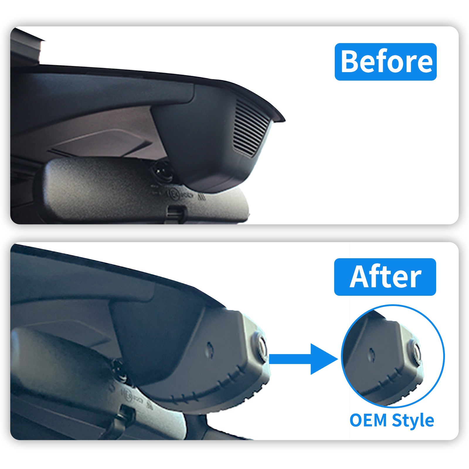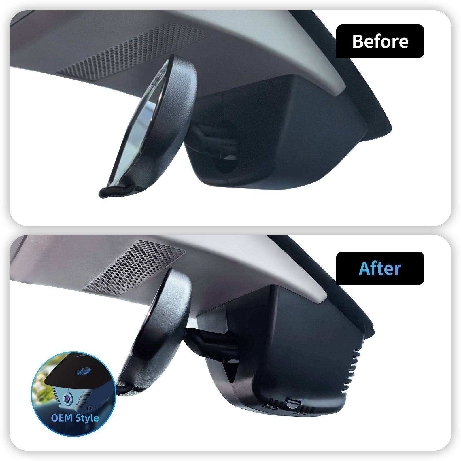 The OEM-style dash cam with a 1:1 restoration of the original rearview mirror back cover shape design, which will not block the driving line of sight.